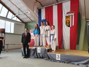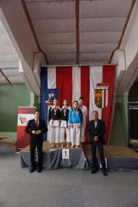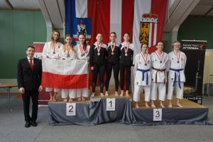 Auch bei den Kumitebewerben lief es ebenfalls gut. Philipp Holy fegte wie ein Wirbelwind über die Matte und gewann souverän, ohne Punkteverlust, die Kategorie Kumite U18 männlich. Die 14-jährige Livia Edler startete bei den Youth Ladies U16 im Kumite, wo sie aber im Semifinale gegen ihre polnische Gegnerin verlor und die Bronzemedaille errang.